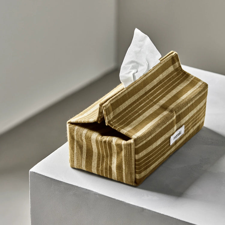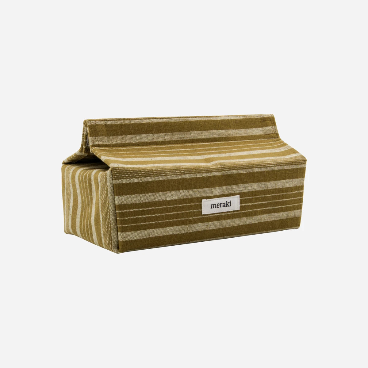 Skab et roligt udtryk i dit hjem med denne eksklusive tissuebox i mørk oliven og beige striber. Blødt, 100 % Oeko-Tex-bomuldsstof giver den et subtilt, tekstilt look, som gør din opbevaring af ansigtsservietter både stilfuld og nem.