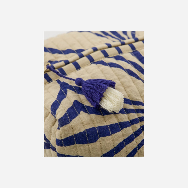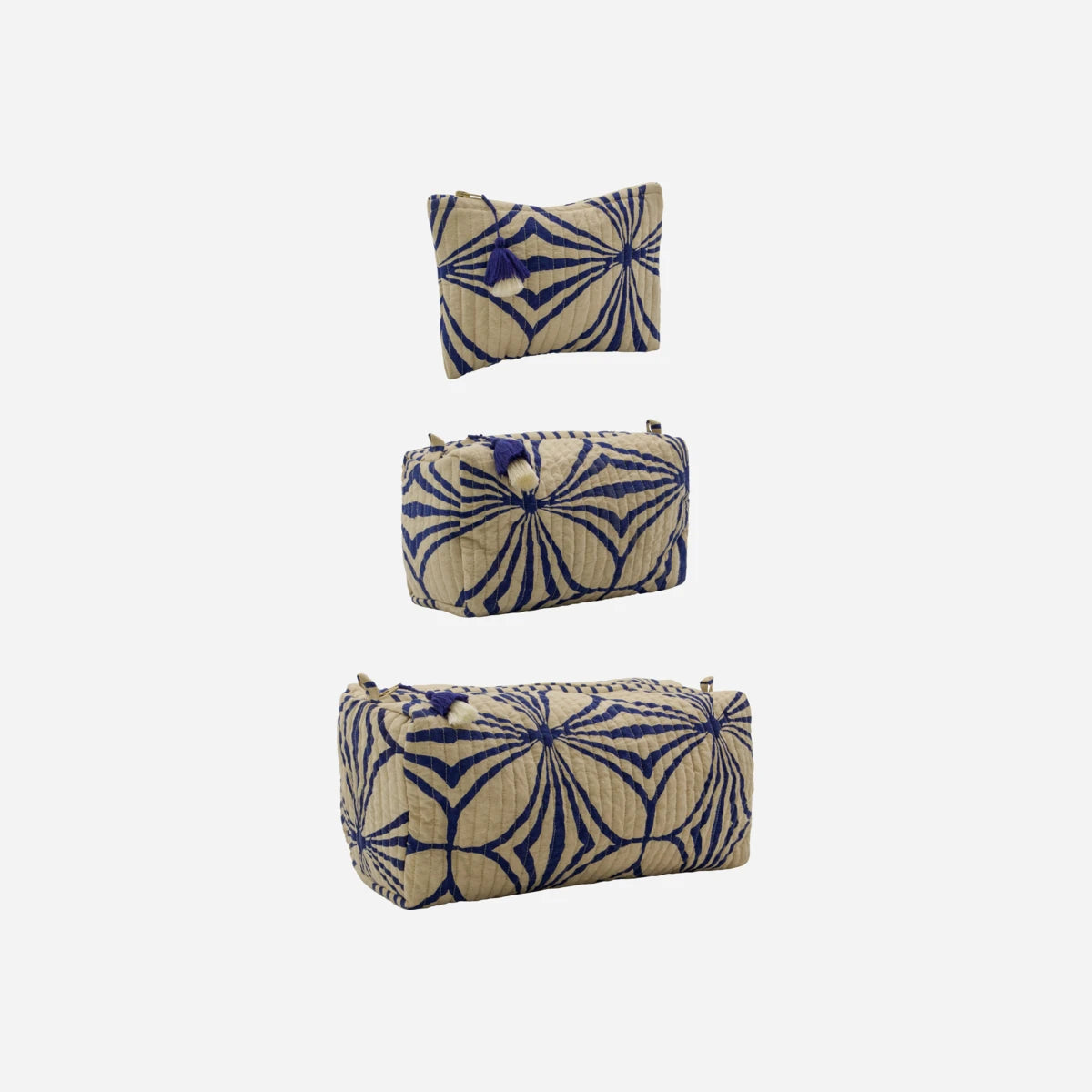 HDCare-sættet består af 3 toilettasker i forskellige størrelser, fremstillet i off-white bomuld med et karakteristisk blåt mønster. De dekorative kvaster på lynlåsen tilføjer et elegant touch.