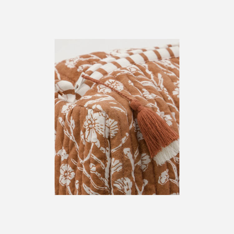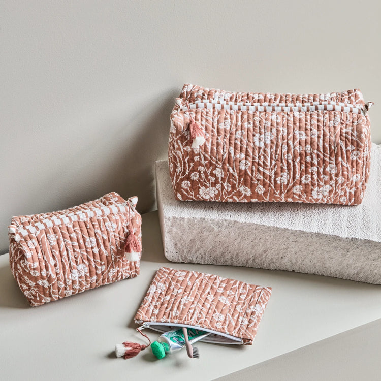 Hold styr på dine toiletsager med HDCare-sættet, som består af 3 toilettasker i bomuld med et diskret mønster i en afdæmpet terracotta-farve. Deres praktiske størrelse gør dem ideelle til opbevaring af skønhedsprodukter eller til det mest nødvendige på rejsen.