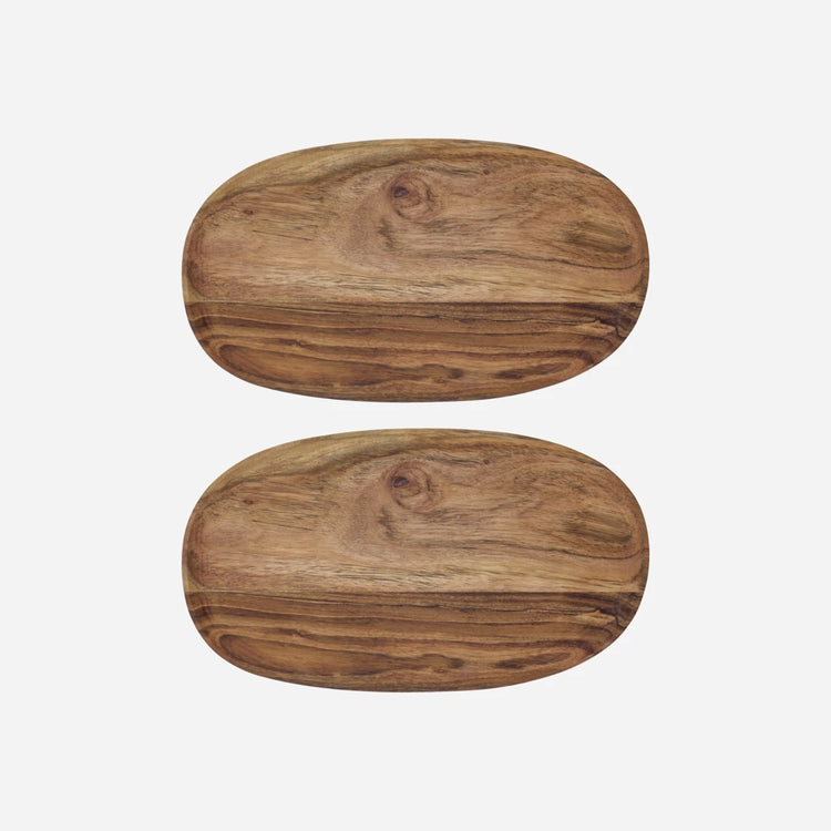Bring et strejf af natur til dit spisebord med disse bakker i akacietræ. Deres enkle og elegante design gør dem perfekte til både servering og som unikke tallerkener til en rustik spiseoplevelse. Den naturlige træstruktur giver varme og charme og inviterer dig til at nyde hvert måltid med stil.- Fremstillet af holdbart akacietræ.- Sættet indeholder to bakker.- Ideel til servering eller anretning- Tilføjer charme til dit bordFøj disse alsidige bakker til din spisesamling.