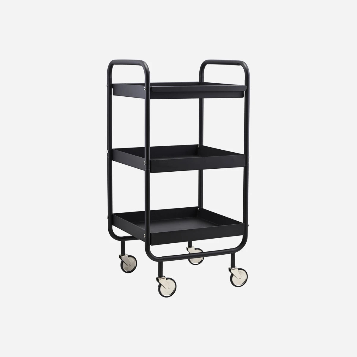En trolley har enormt mange praktiske funktioner og samme gælder denne fra House Doctor. Navnet på den fine trolley er Roll. Den er lavet af materialet stål, som efterfølgende er lakeret i en mat, sort farve, der giver den et stilfuldt udtryk. Roll måler 42 cm i længden, 38 cm i bredden og 85 cm i højden. Med den aftagelige pakke er den perfekt som et møbel i køkkenet. På bakken kan du stille morgenkaffen, og servere den på sengen herefter. Roll er på fire hjul, hvilket gør den nem at flytte rundt med.