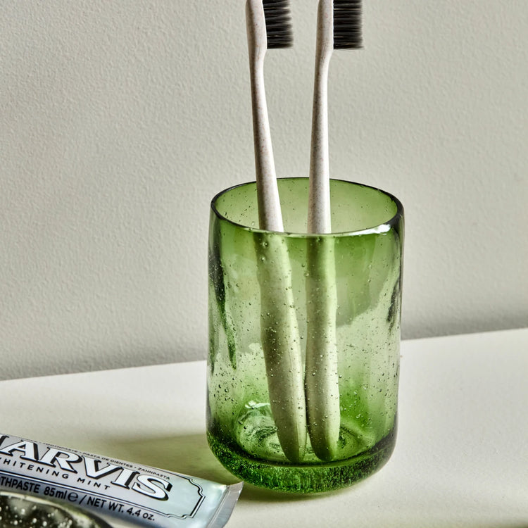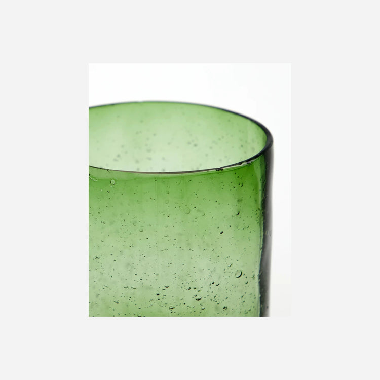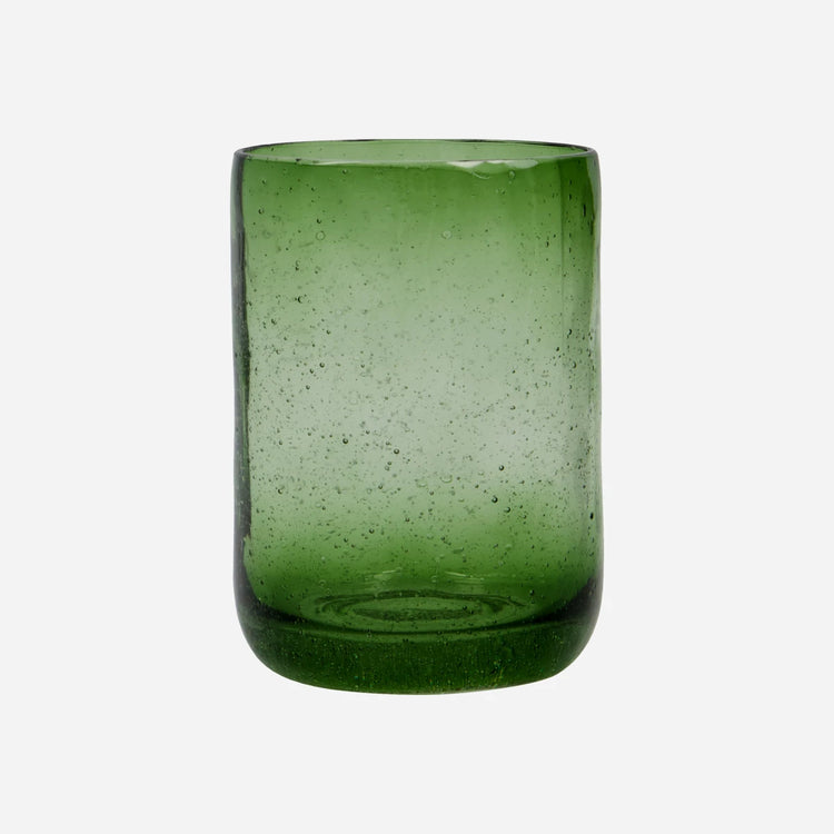 Dette HDWah-glas er lavet af grønt glas med en organisk, ujævn overflade og diskrete luftbobler. Det solide design kombinerer hverdagsbrug og funktionalitet med æstetik.