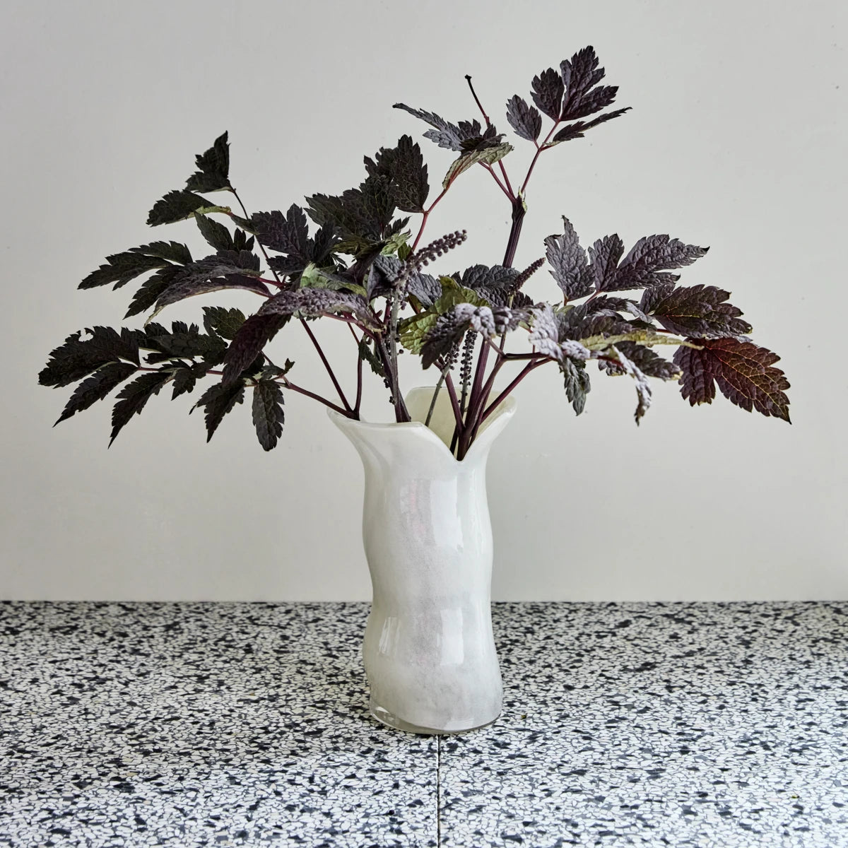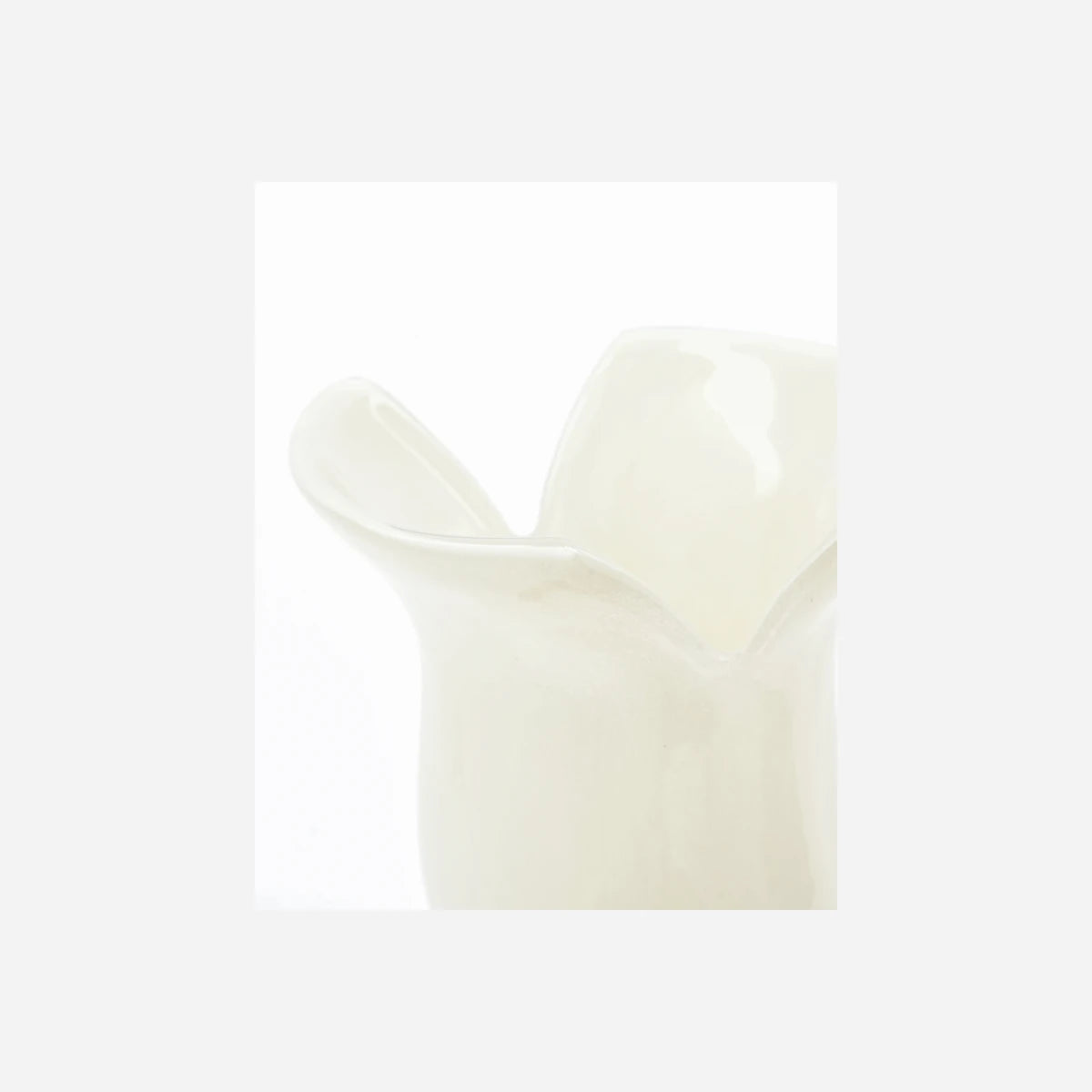 HDCuff er en glasvase i råhvid skiller sig ud med sin foldede kant og organiske silhuet. Den semitransparente overflade og de bløde former giver den et raffineret og skulpturelt udtryk.