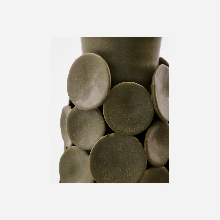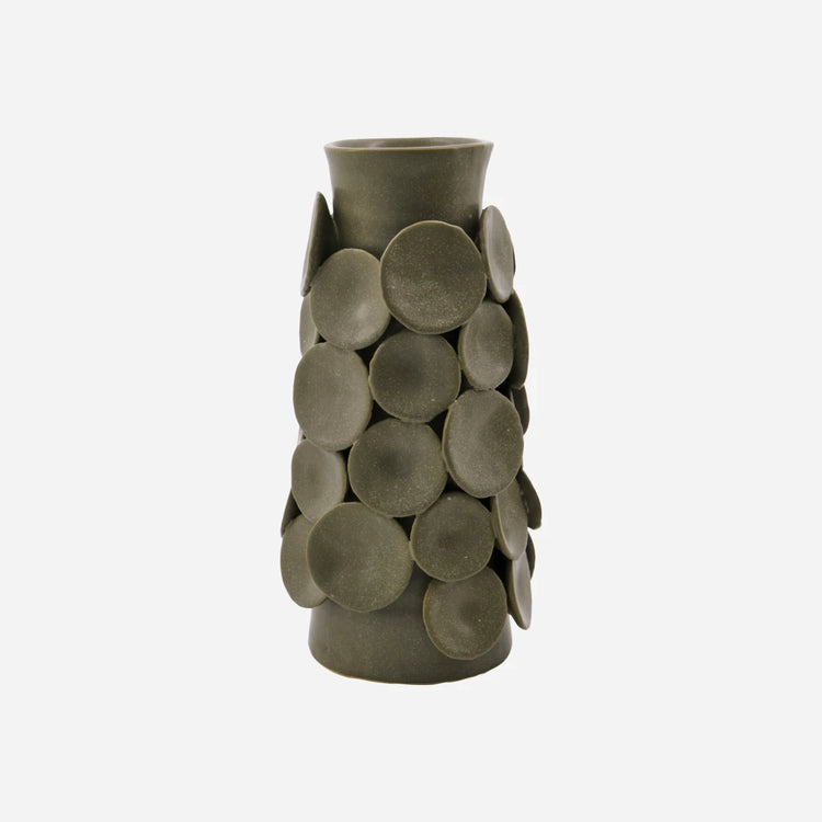 Kunstnerisk stoneware-vase med påsatte cirkulære elementer, der skaber et skulpturelt udtryk. Den håndlavede keramik i mat khaki-nuance fremhæver de taktile detaljer og giver en elegant dybde til det iøjnefaldende design.