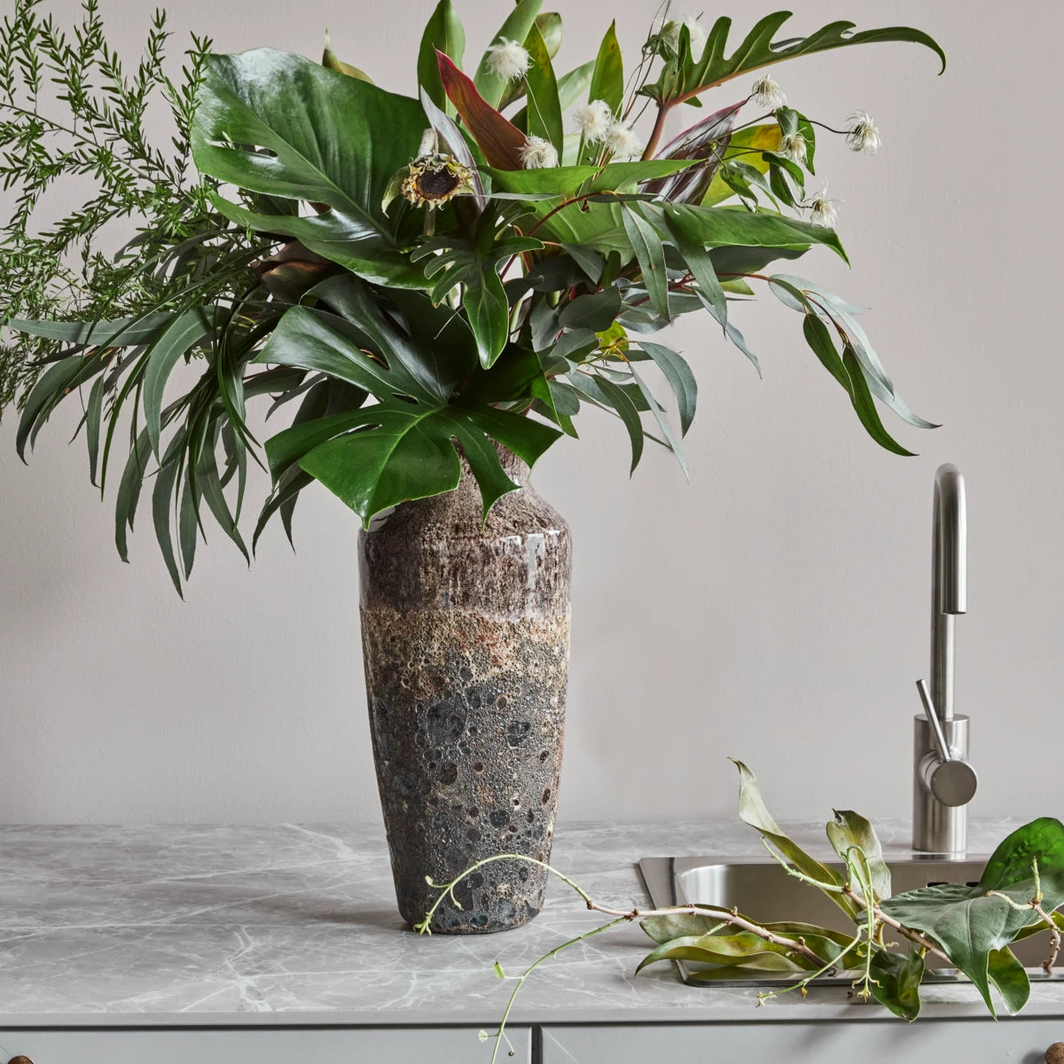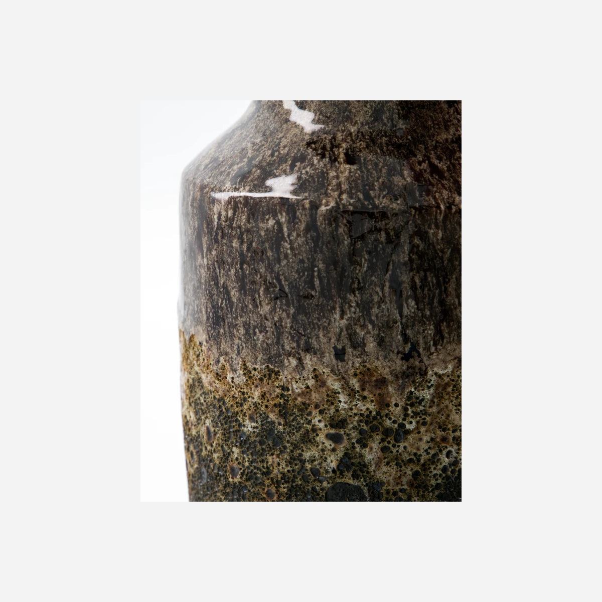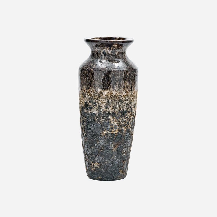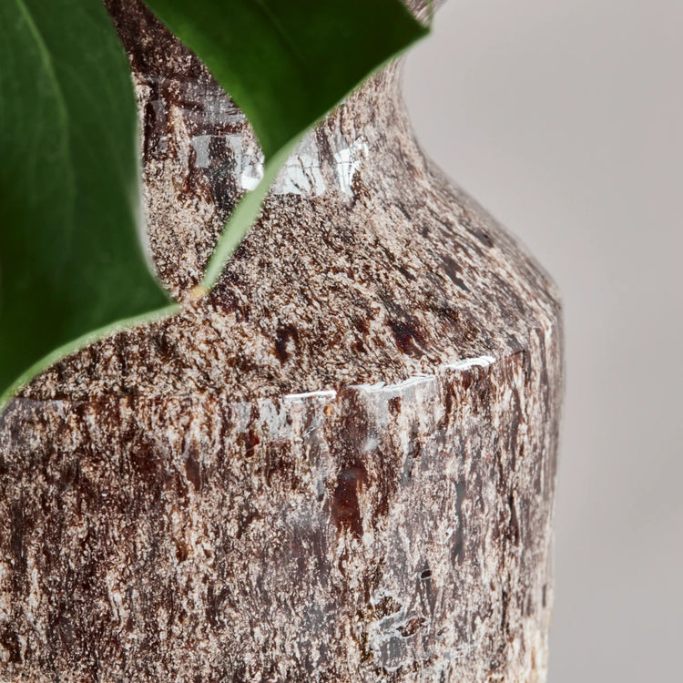 Denne håndlavede vase i antik brun keramik har en unik glasur, der varierer smukt. Perfekt som et kunstværk eller til fremvisning af afklippede grene. Vasernes unikke finish sikrer, at ingen to vaser er ens.- Unikt håndværk- Distinkt antik brun glasur- Ideel til afklippede grene- Hver vase er unikTilføj et kunstnerisk præg til dit hjem.