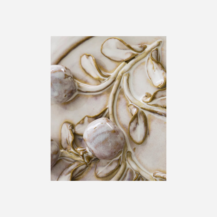 Denne runde wall art i råhvidt stentøj balancerer det moderne og det legende med dekorative frugtmotiver og et smil på læben. Håndlavet og med en glaseret overflade tilføjer den karakter og kreativitet i dit hjem. Skab et personligt statement på væggen alene, eller sæt flere sammen for at skabe et inspirerende udtryk.