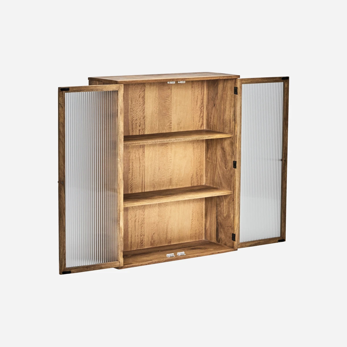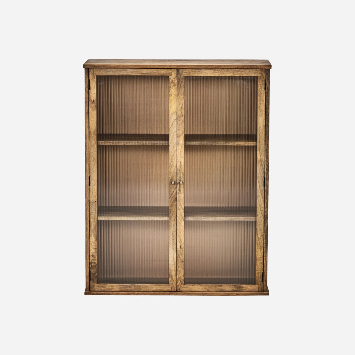 Indfør raffinement i dit hjem med dette udsøgte vægskab, der er fremstillet af mangotræ med en glasfront. Den antikbrune finish og de raffinerede, riflede sider skaber et tidløst design, der passer til ethvert interiør. Dette skab er ideelt til udstilling af bøger, glas eller dekorative skulpturer og giver et strejf af eksklusivitet til din stue eller spisestue. Glasfronten giver en stilfuld måde at fremvise dine ting på, samtidig med at den tilføjer elegance til din indretning.- Håndlavet mangotræ.- Elegant glasfront.- Raffineret riflet design.- Antikbrun finish.Tilføj dette stilfulde vægskab til din bolig.