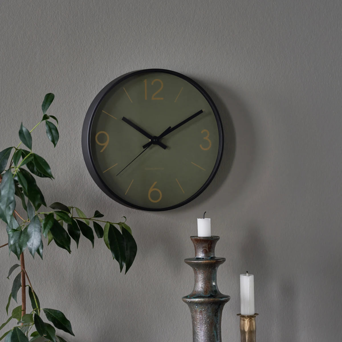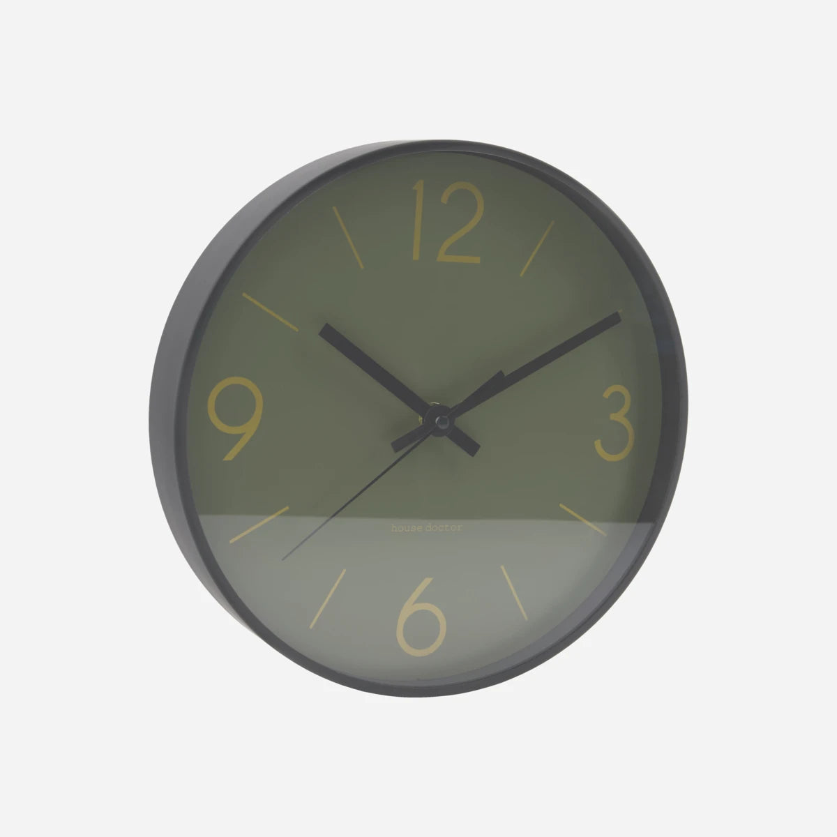 Tilføj et afslappet touch til din indretning med dette runde vægur fra House Doctor. Den mørkegrønne farve kombineres med de guldfarvede tal og den sorte ramme for at skabe et design, der passer til enhver indretningsstil. Hæng det på køkkenvæggen eller i din stue imellem dine plakater og andre kunstværker på væggen. Brug det ethvert sted, hvor du gerne vil have styr på, hvad klokken er.